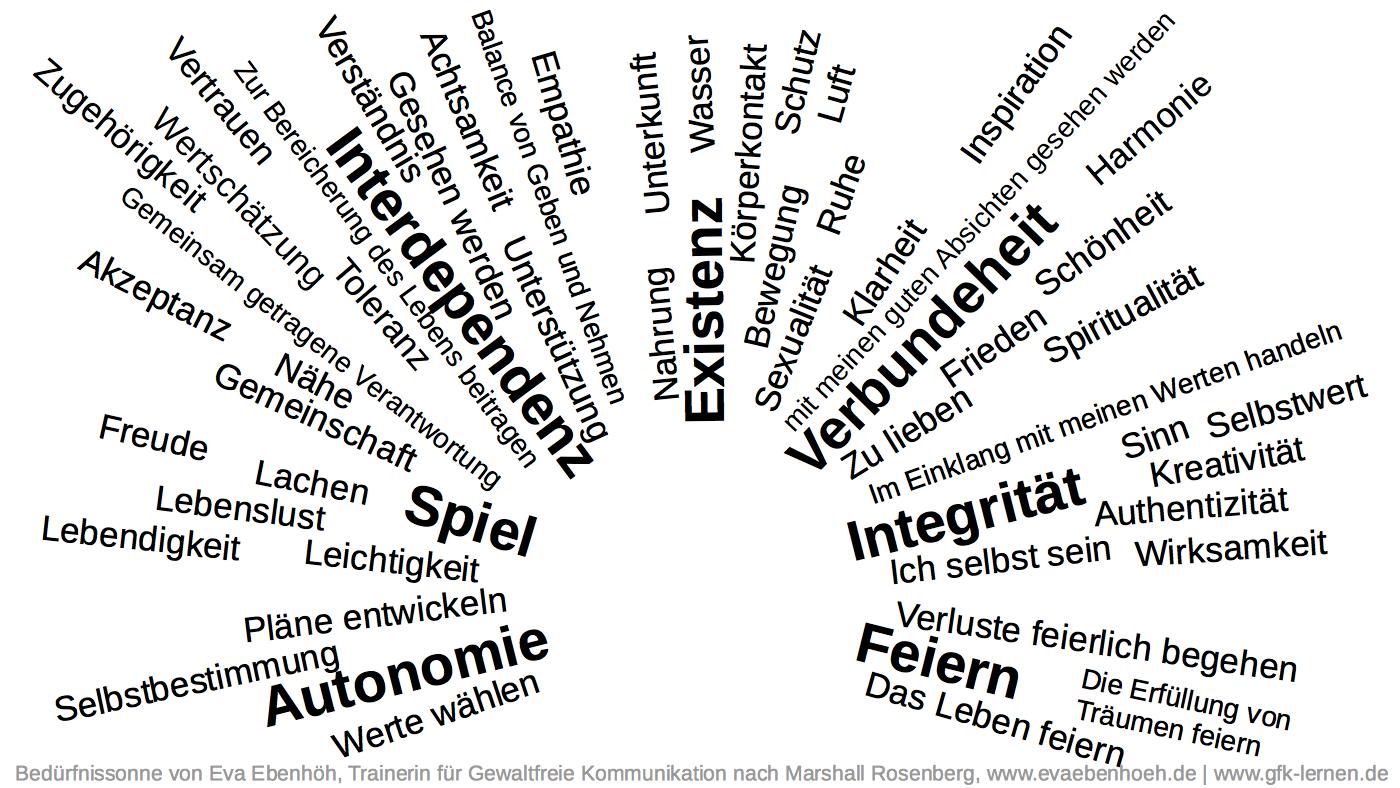 In dieser Bedürfnissonne findest du Bedürfnisbegriffe nach den sieben Kategorien Feiern, Authentizität, Integrität, Verbundenheit, Interdependenz, Spiel und Existenz sortiert.