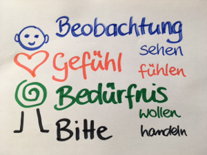 Der Weg, den Marshall Rosenberg vorschlägt, ist, die Aufmerksamkeit auf vier Elemente zu richten, die vier Schritte der Gewaltfreien Kommunikation.